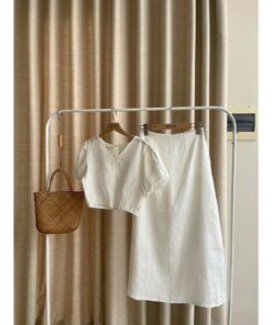 Rập set váy áo: chân váy lưng liền may dây kéo bên hông, sau có thun, áo dáng croptop.