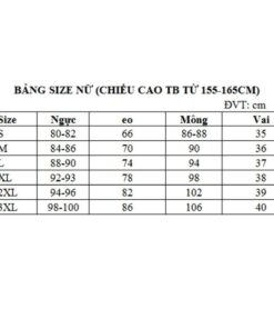 + XL : ngực 92cm; vai 38cm; eo 78cm; mông 98cm ; cao 155-160cm