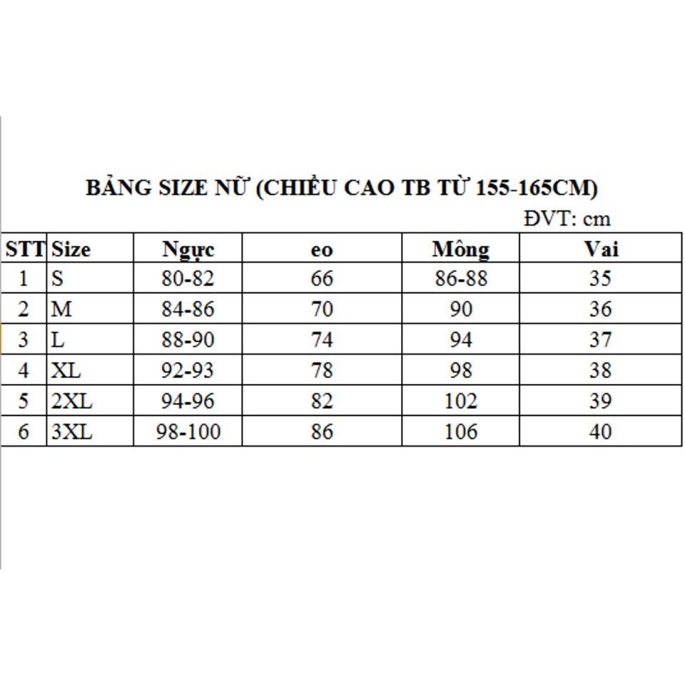 + XL : ngực 92cm; vai 38cm; eo 78cm; mông 98cm ; cao 155-160cm