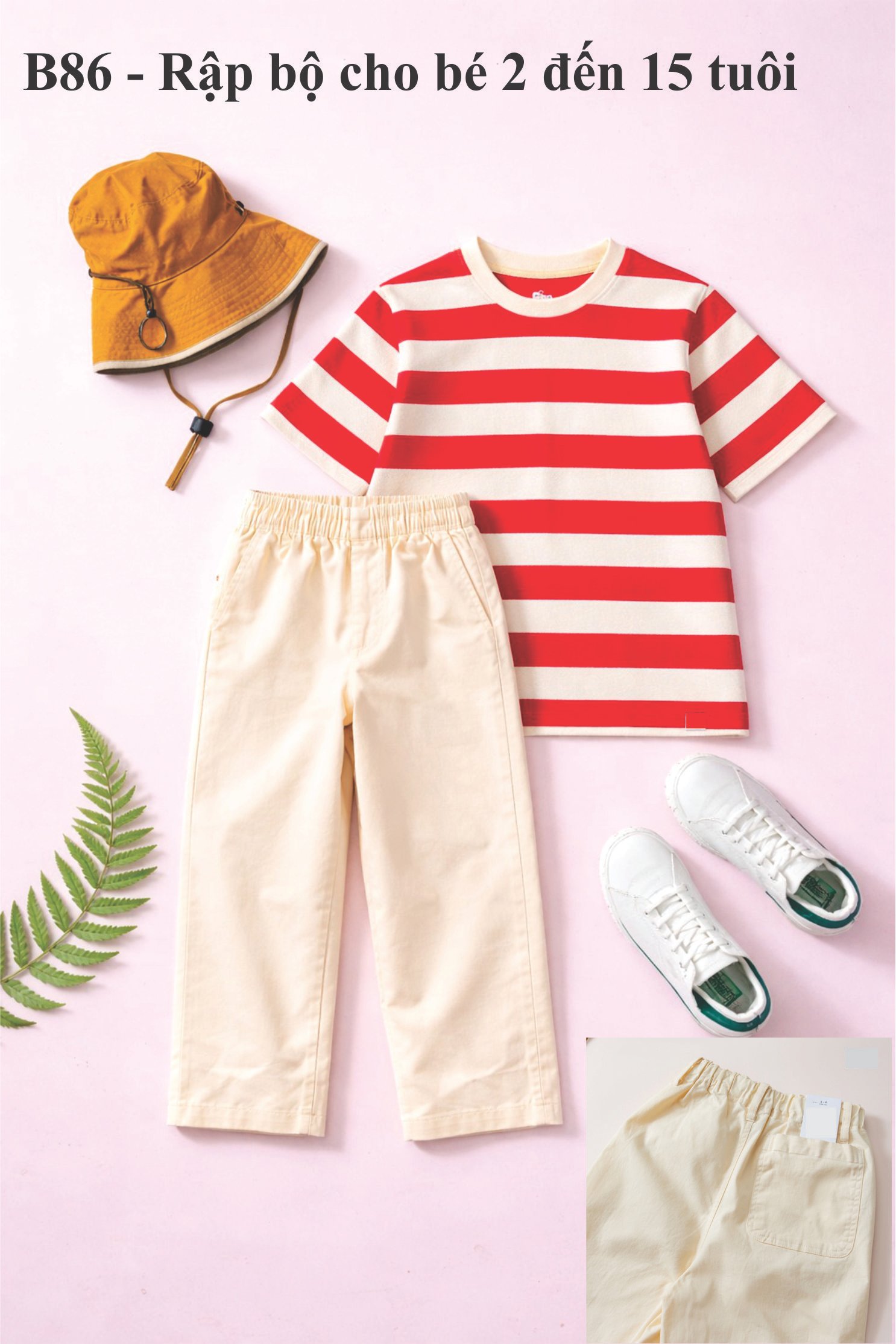 Rập giấy A0 mã B86 – Rập may nguyên bộ : áo vải thun vai xệ, quần cho vải thô, kaki, lưng thun có túi bên hông và 1 túi đắp sau.