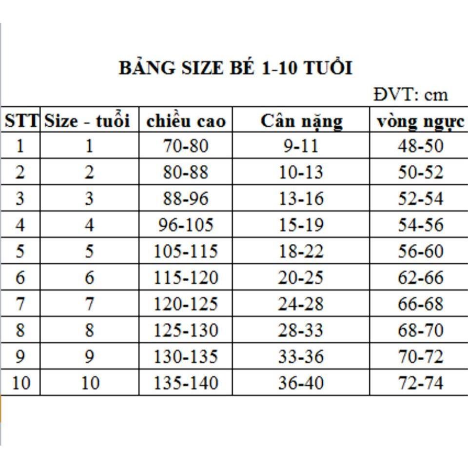 size8 : 125-130cm; 28-33kg; ngực 68-70cm;