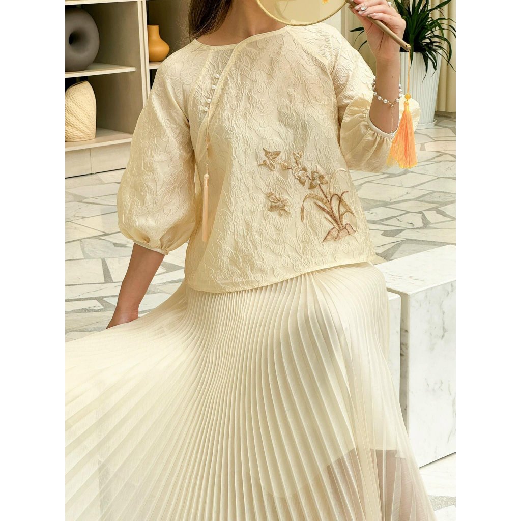 Rập được in từ giấy A0 – Dạng bảng vẽ, không phải sản phẩm. Rập đã được may thử, hợp với vải linen, tapta, voan tơ, gấm.