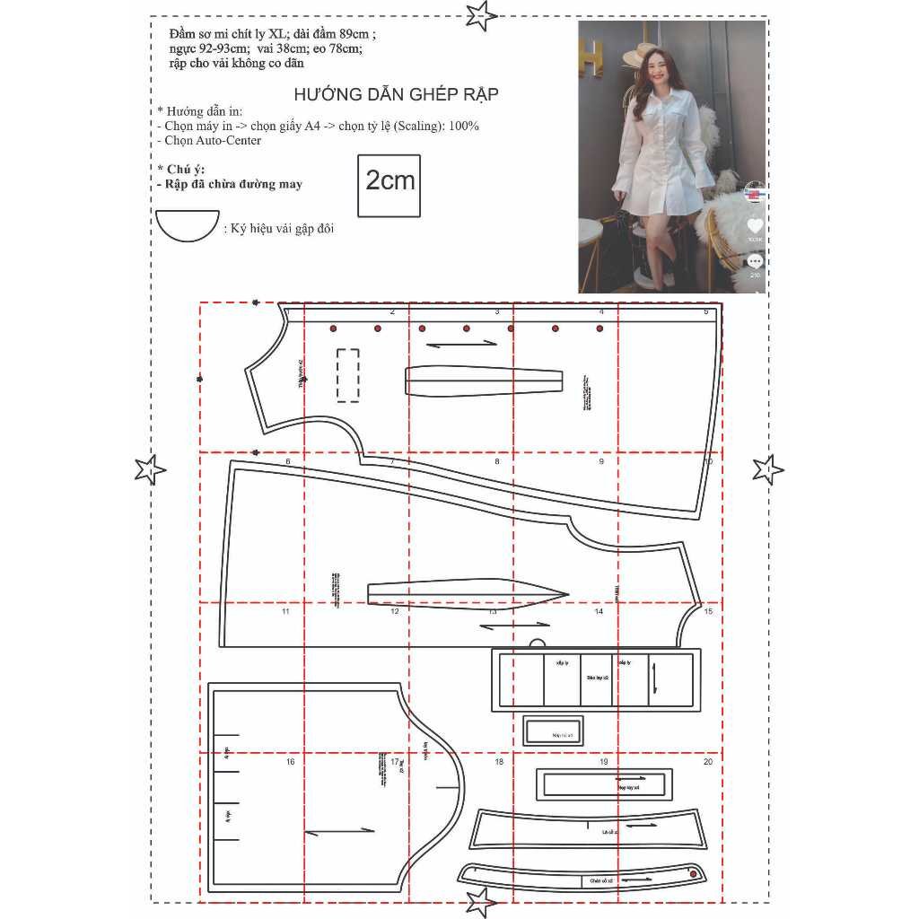 + 2 XL: ngực 96cm; vai 39cm; eo 82cm; mông 102cm