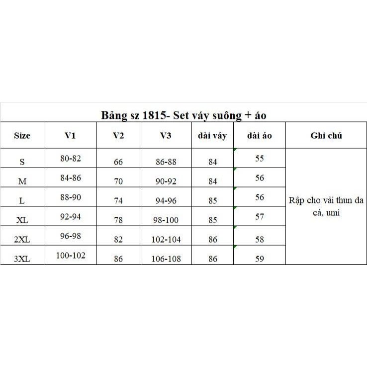 + 2 XL: ngực 96cm; vai 39cm; eo 82cm; V3: 102cm