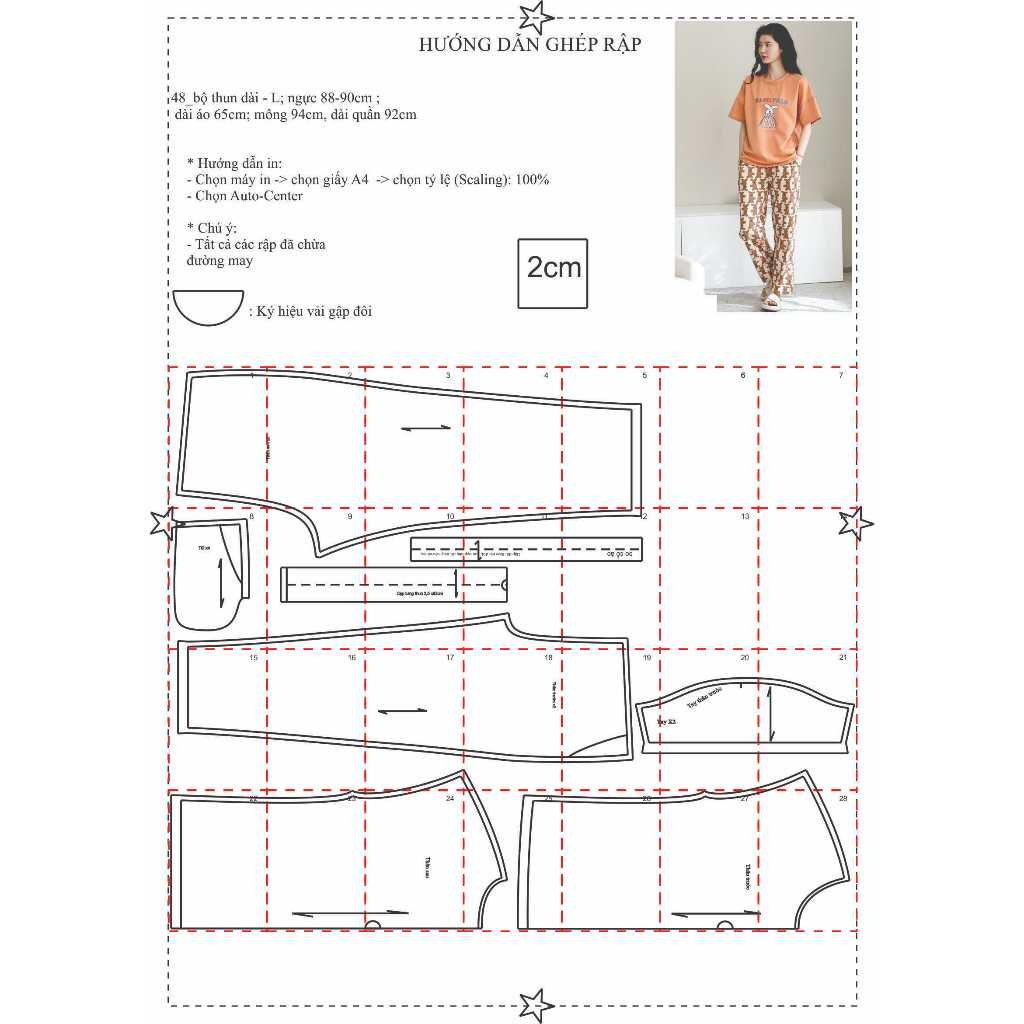 Rập được in từ giấy A0 – Dạng bảng vẽ, không phải sản phẩm. Rập đã được may thử, hợp với vải thun cotton.