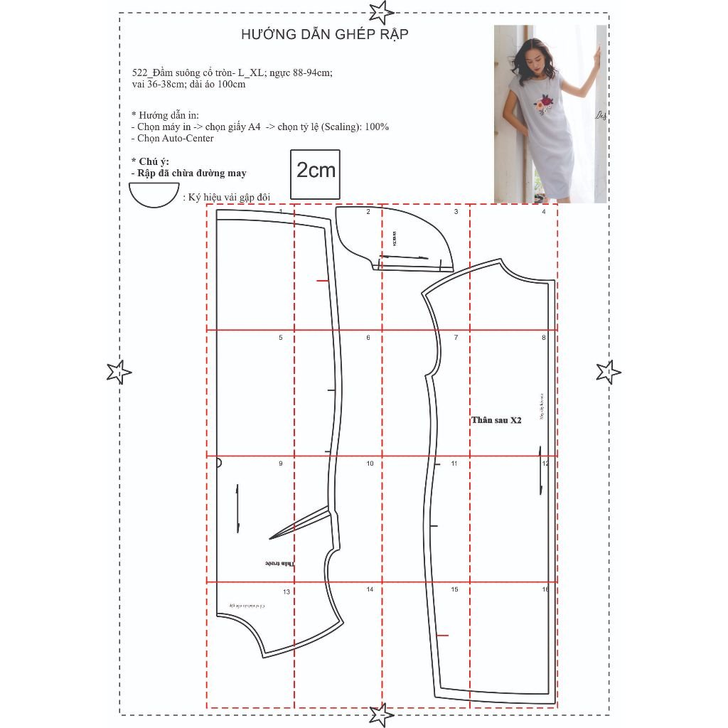 Rập giấy A0 mã 522 – rập đầm tay liền, có may dây kéo sau – dành cho vải linen, đũi.