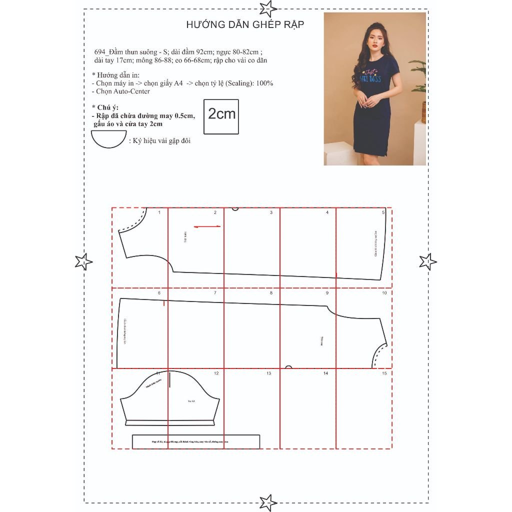 Rập được in từ giấy A0 – Dạng bảng vẽ, không phải sản phẩm. Rập đã được may thử, hợp với vải da cá, thun cotton.