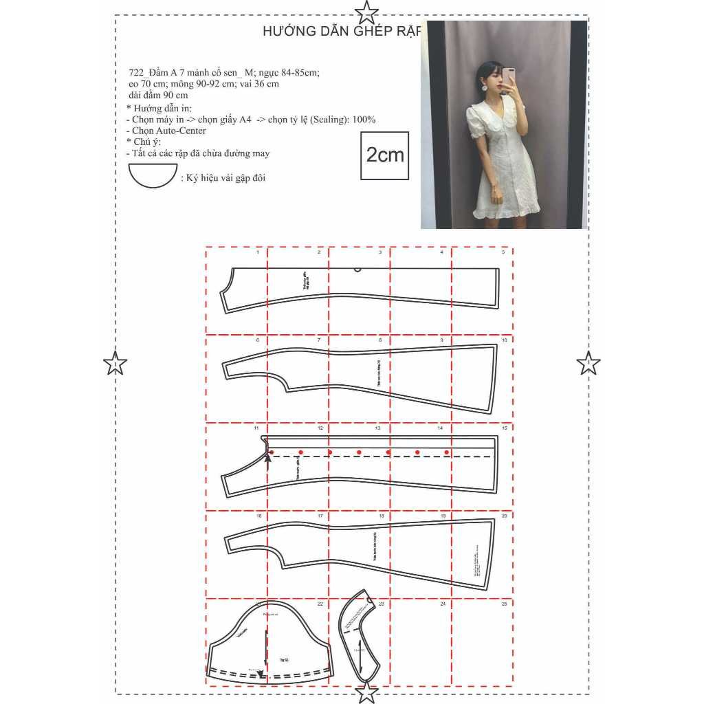 Rập giấy A0 mã 722 – đầm cổ sen 7 mảnh.