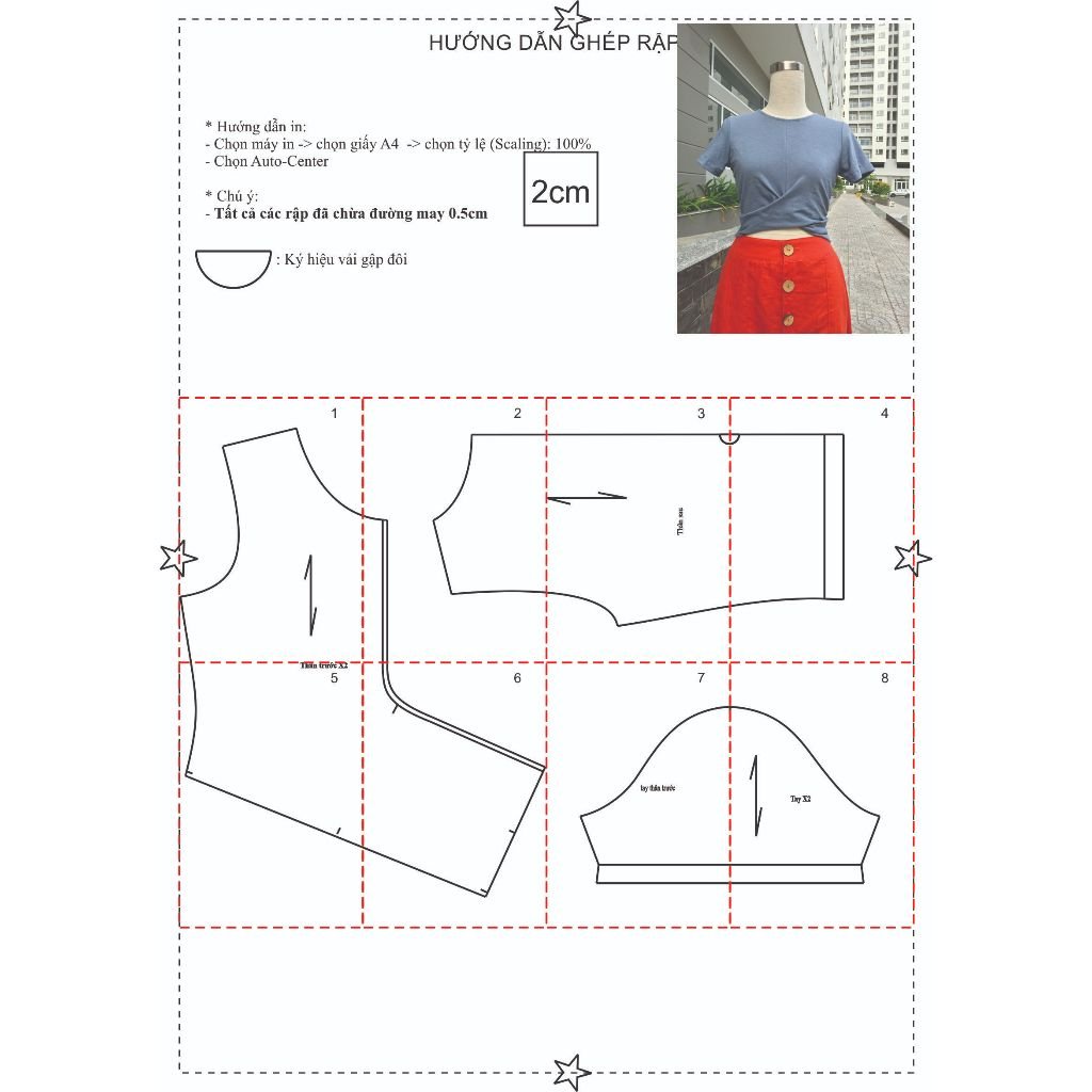 Rập được in từ giấy A0 – Dạng bảng vẽ, không phải sản phẩm. Rập đã được may thử – hợp với vải thun cotton