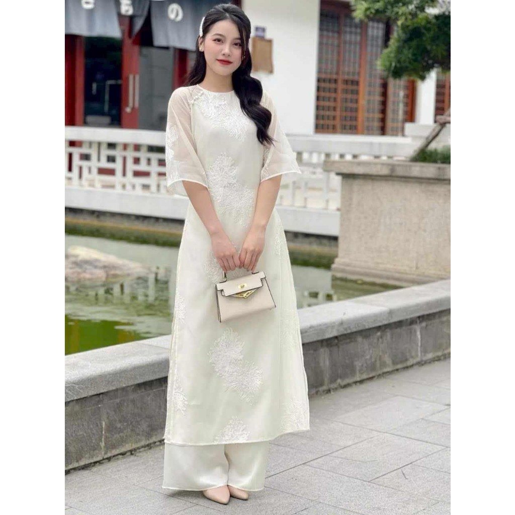Rập áo dài dáng suông nhẹ, tay loe cổ tròn, quần may dây kéo chìm.