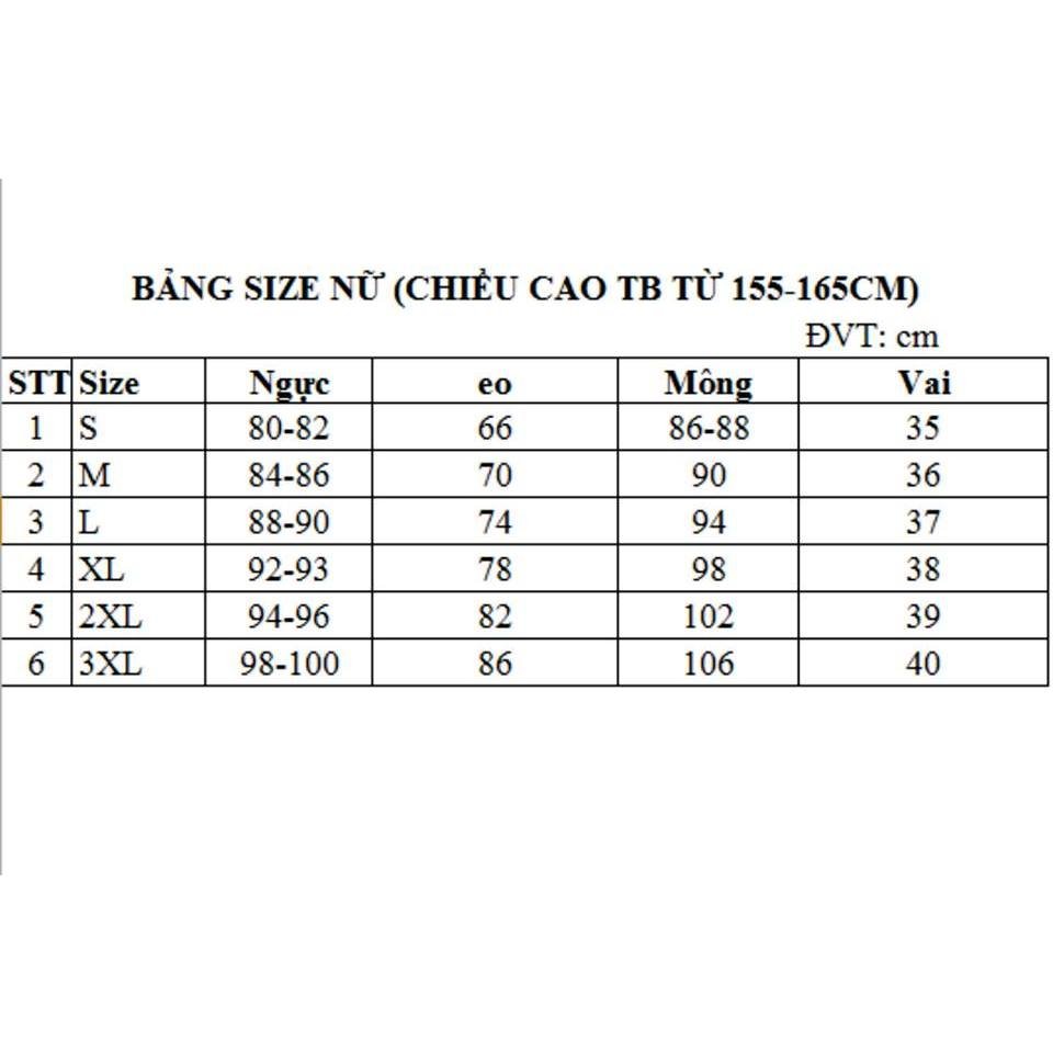+ XL : ngực 92cm; vai 38cm; eo 78cm; mông 98cm ; cao 155-160cm