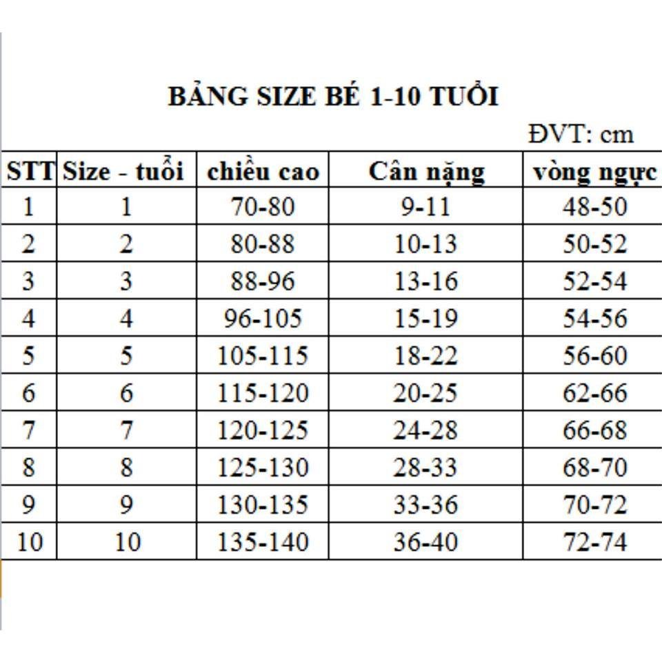 size 10: 135-140cm; 36-40kg; ngực 72-74cm